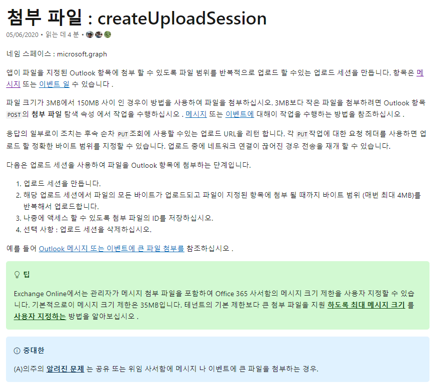 - OneDrive 파일 업로드 => 대용량은 업로드 세션 만들어서 사용 : OneDrive 대용량 파일 업로드