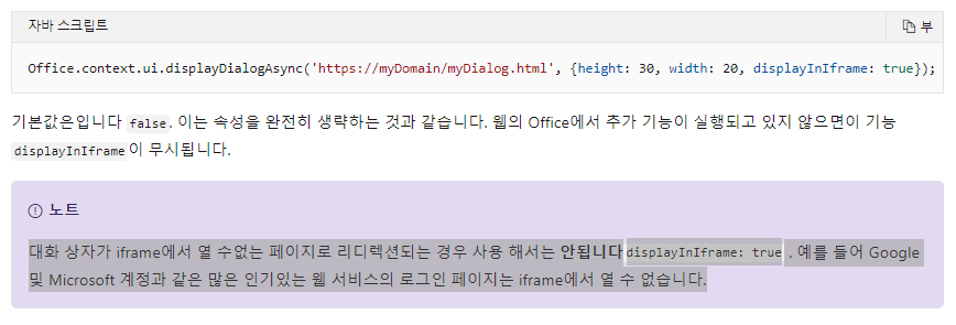 - 팝업은 Office dialog API를 사용해서 열어야 함 => 참고