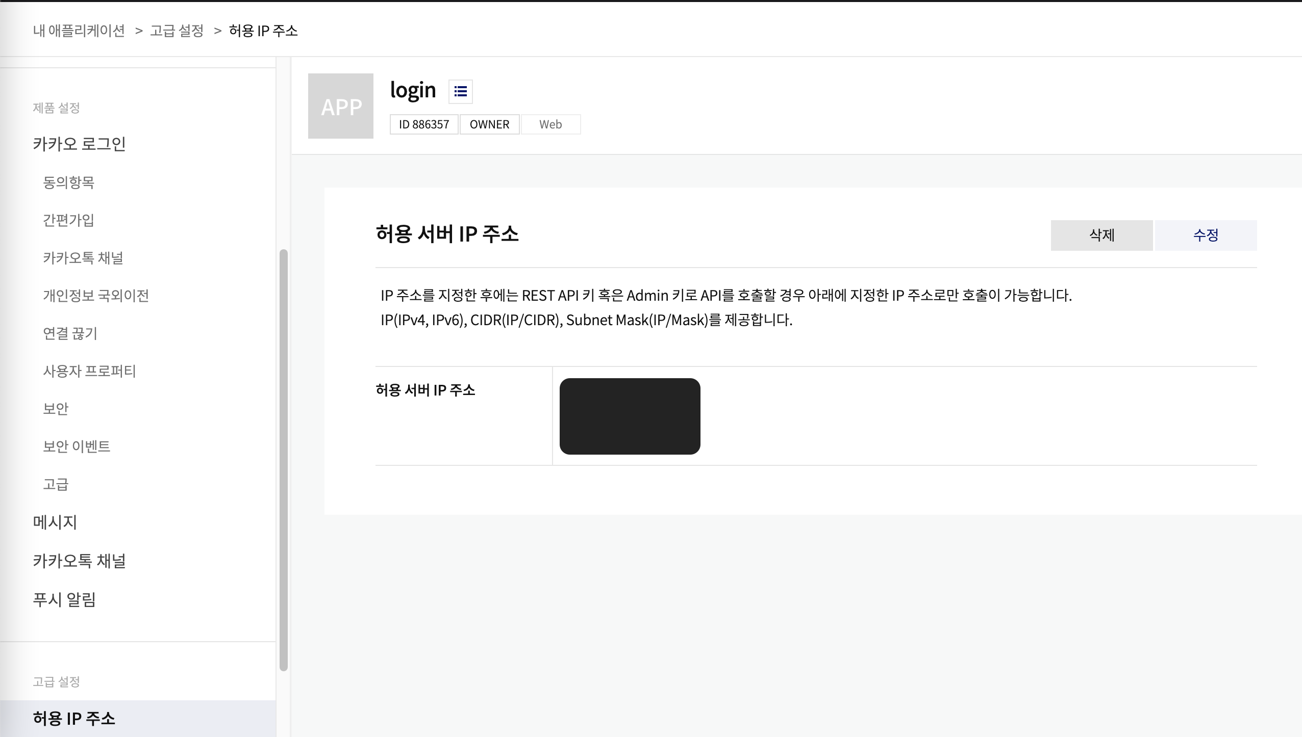사용자 정보를 조회하기 전 카카오 개발자 센터의 내애플리케이션에서, 허용IP가 등록되어 있는지 확인해야 한다.