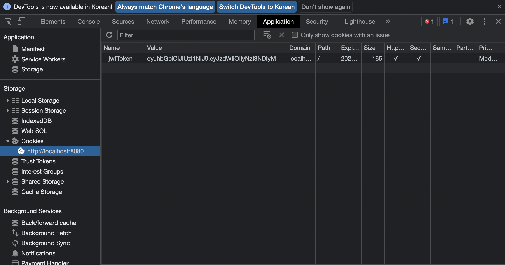 쿠키에 저장된 토큰을 확인할 수 있다.