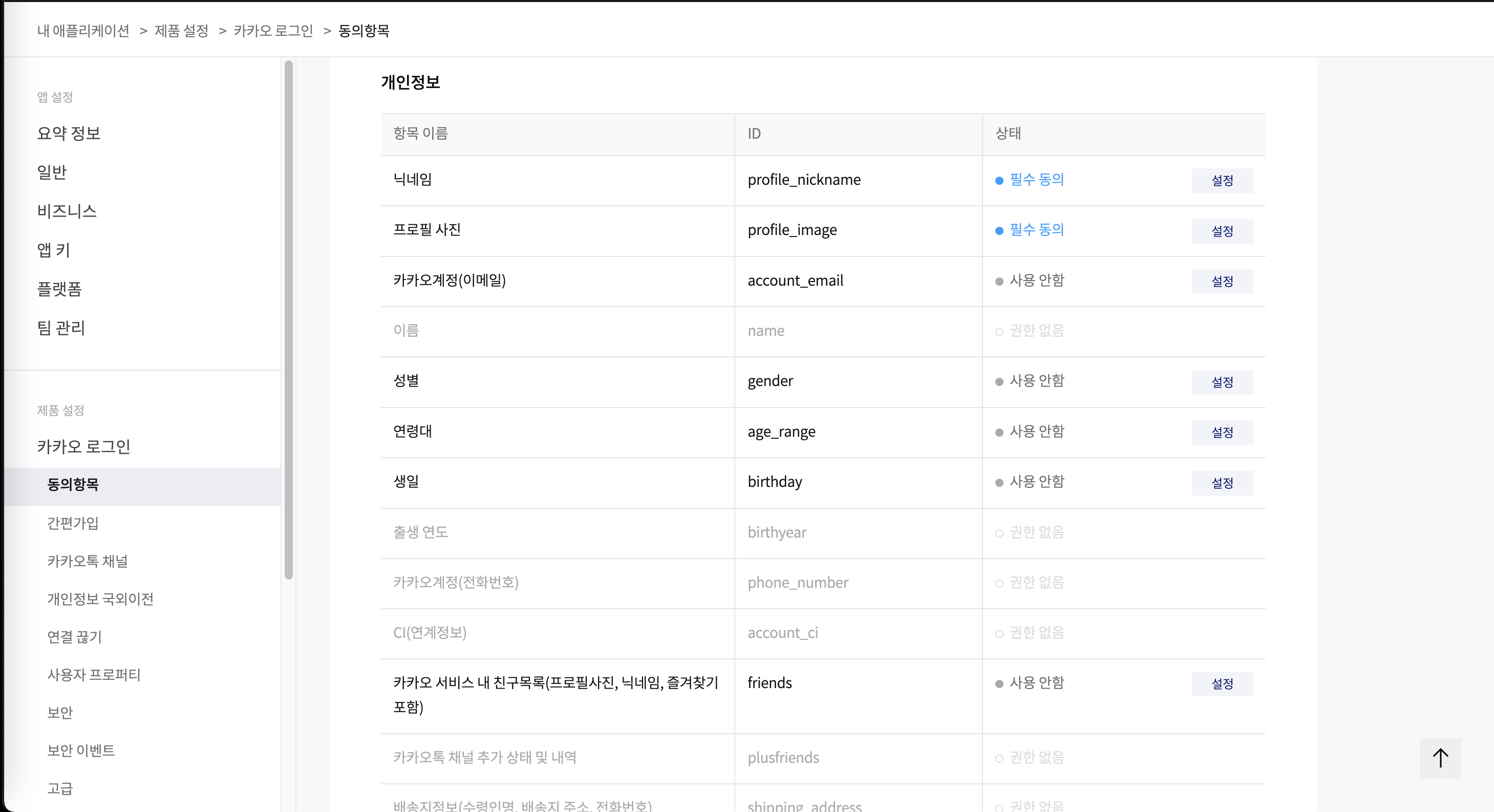 제품설정 > 동의항목에서 로그인 시 제공받을 항목을 선택한다.