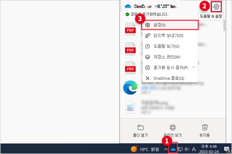 먼저, 작업표시줄의 원드라이브 아이콘을 선택한 후에 설정 아이콘을 클릭하여 원드라이브 설정에 접속한다.