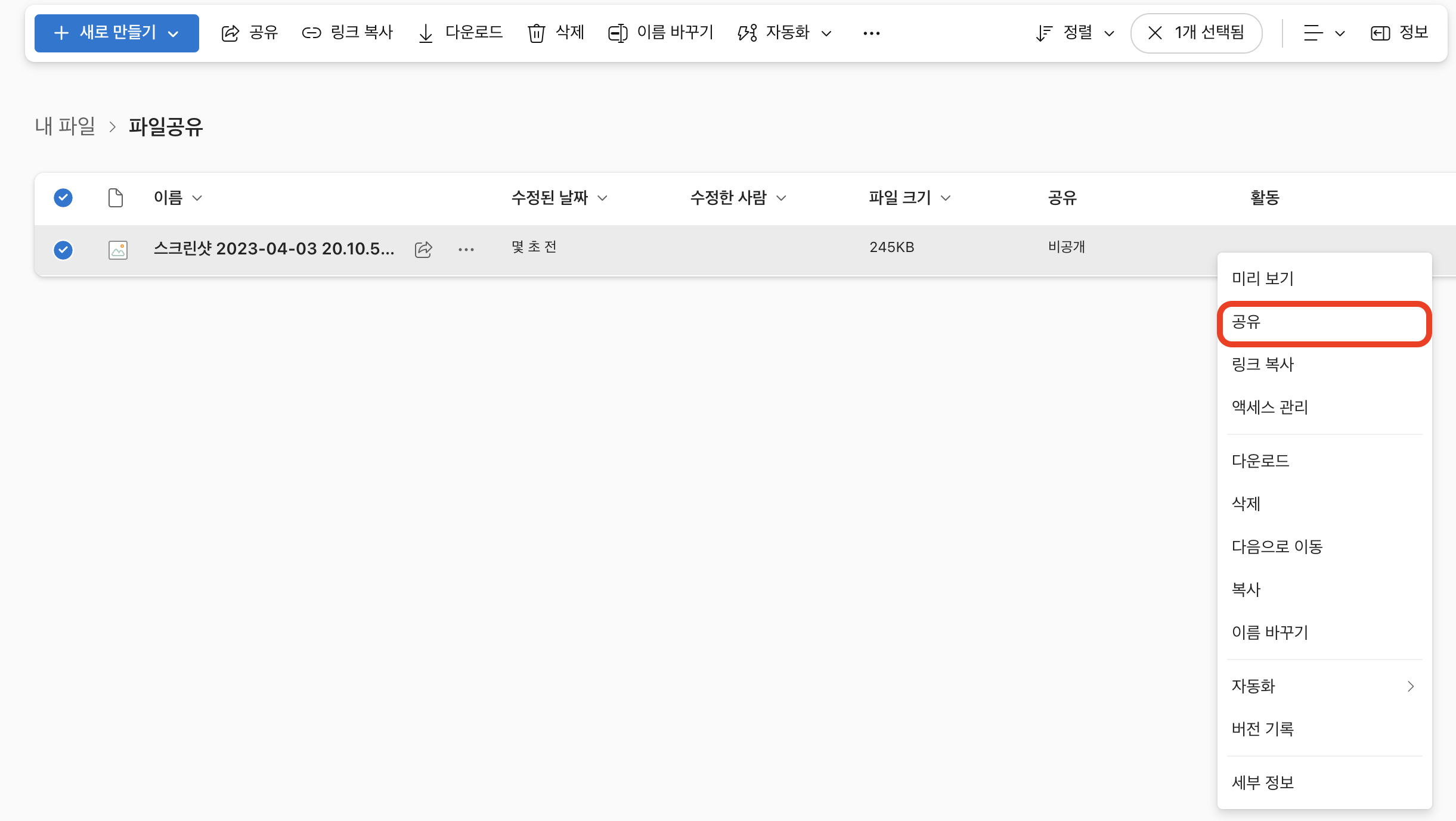 1. 업로드한 직후 공유 버튼을 누르거나, 공유할 파일을 선택한 다음 오른쪽 마우스를 클릭하여 공유를 누른다.