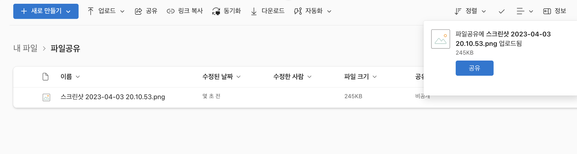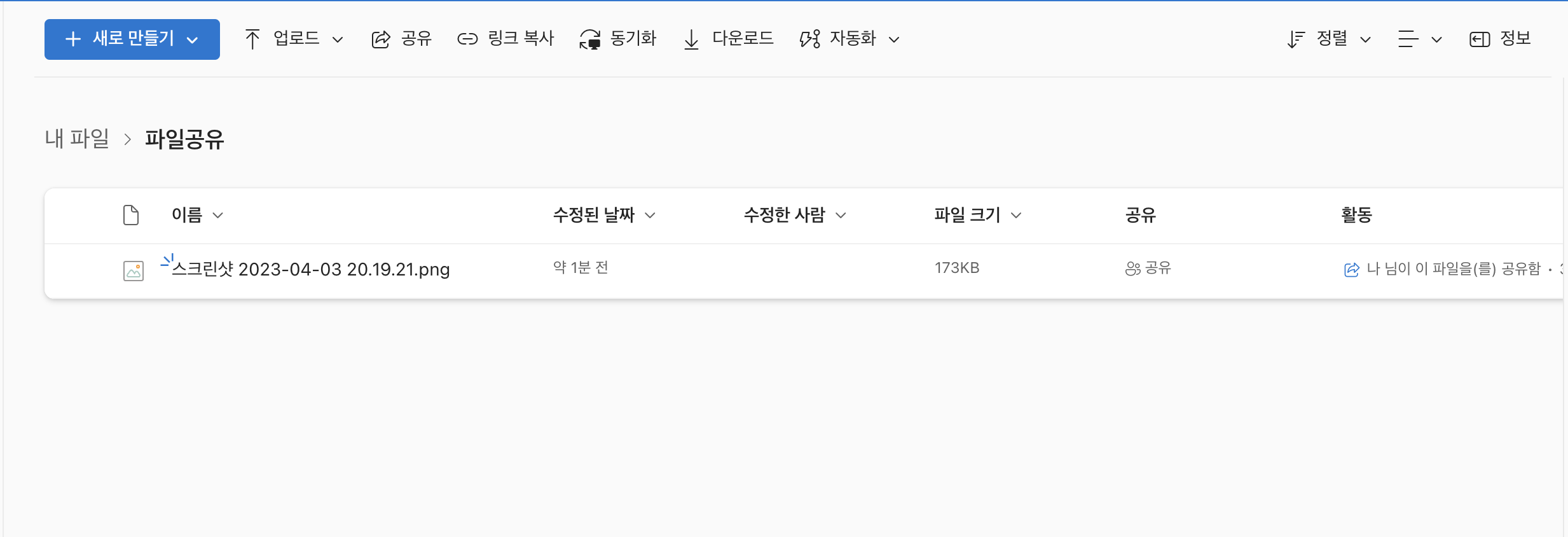 업로드 한 파일을 공유 상태로 변경하면 파일을 수정했을 때, 수정버전으로 확인이 가능하기 때문에 공동 작업을 해야 하는 경우 등 해당 기능을 유용하게 사용할 수 있다.