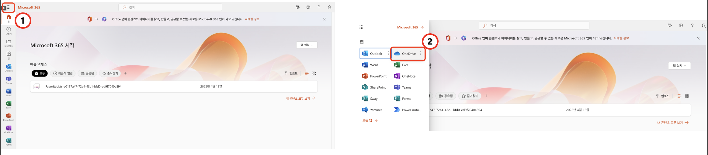 2. 로그인 후 홈화면에서 [메뉴] -> [OneDrive]를 클릭한다.