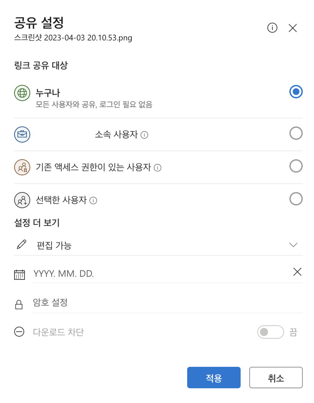 - [선택한 사용자] : 다운로드 링크를 가지고 있어도, 지정한 사용자만 다운로드가 가능하다.