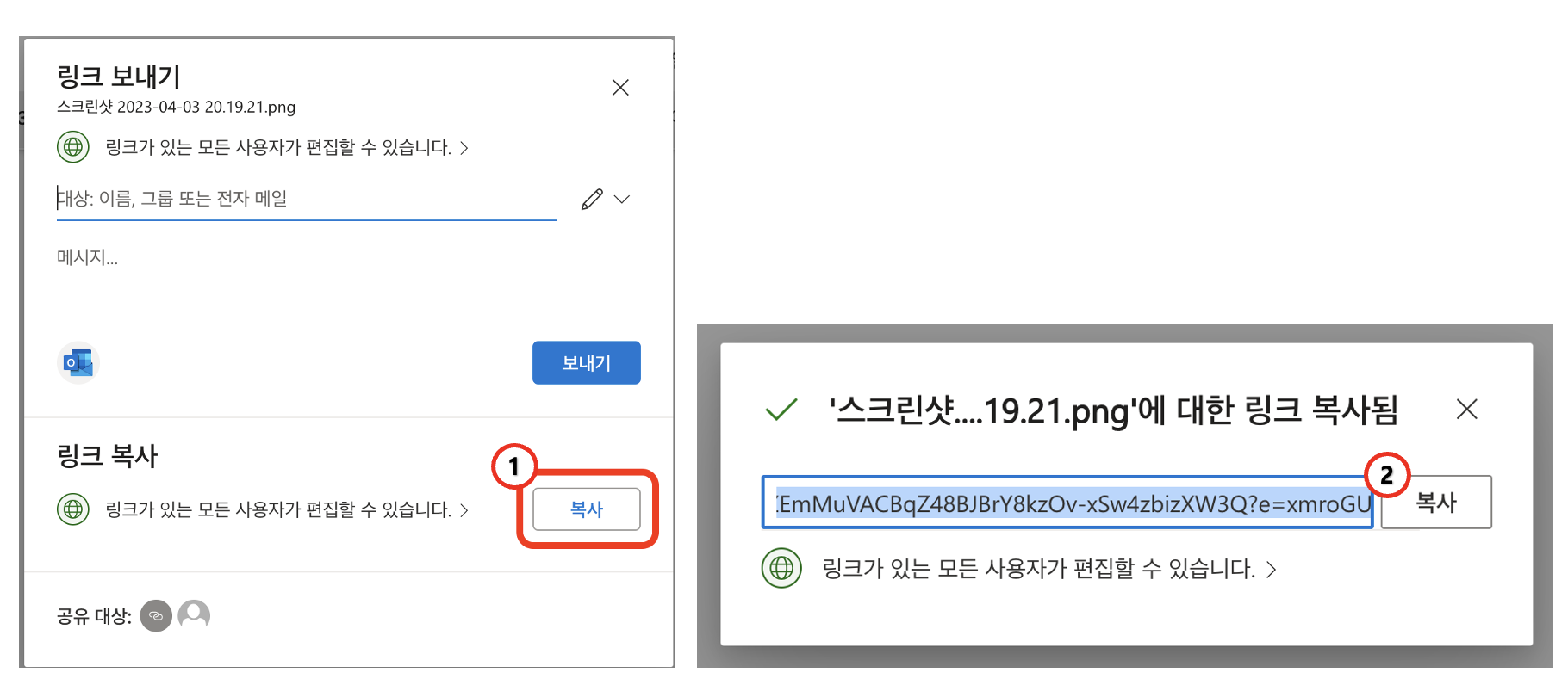 3. 링크 복사의 [복사]를 클릭하여 링크를 생성한 후 해당 링크를 공유하고자 하는 사용자에게 전달한다.