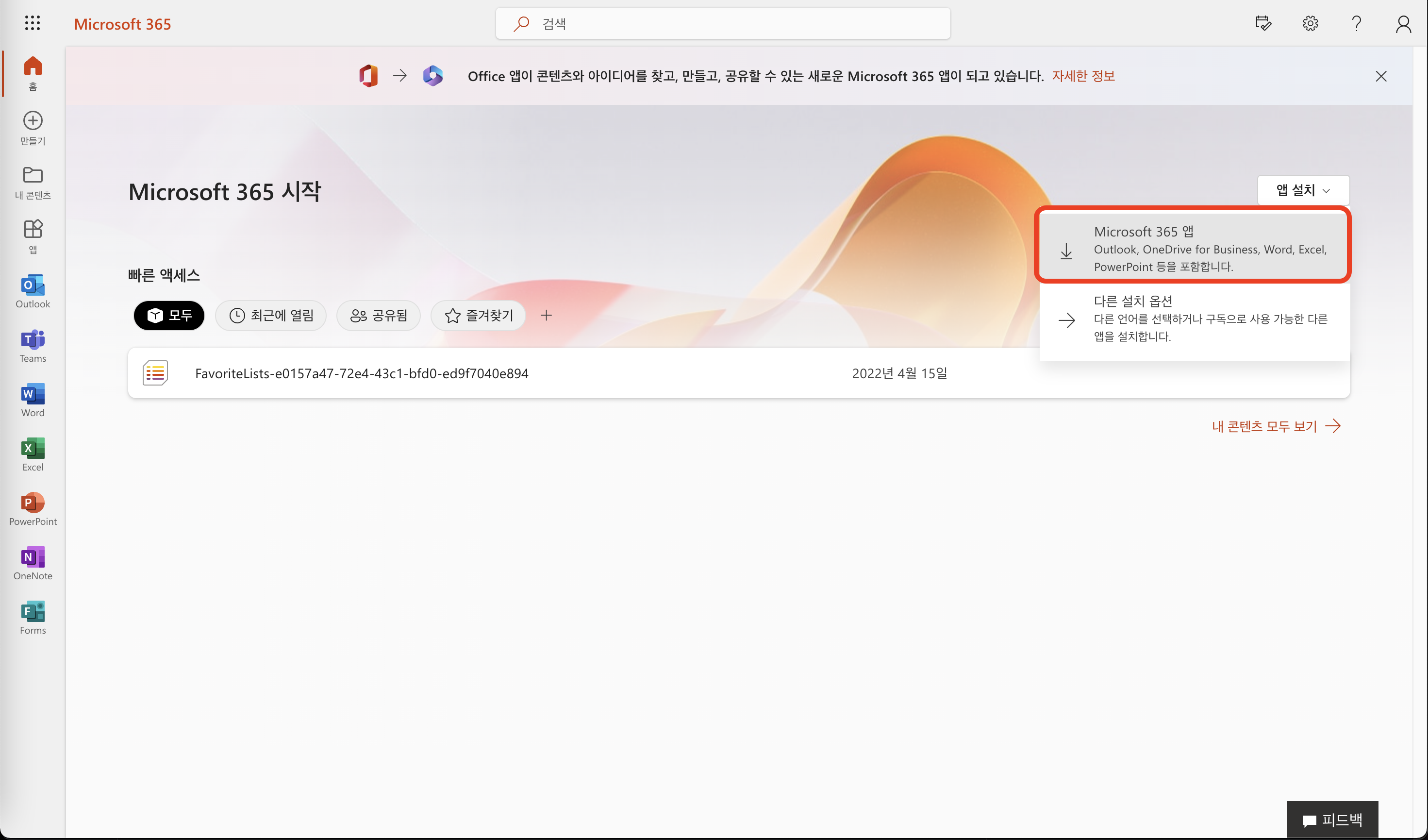 ② microsoft 365 앱을 클릭하여 설치파일을 다운로드 받는다.