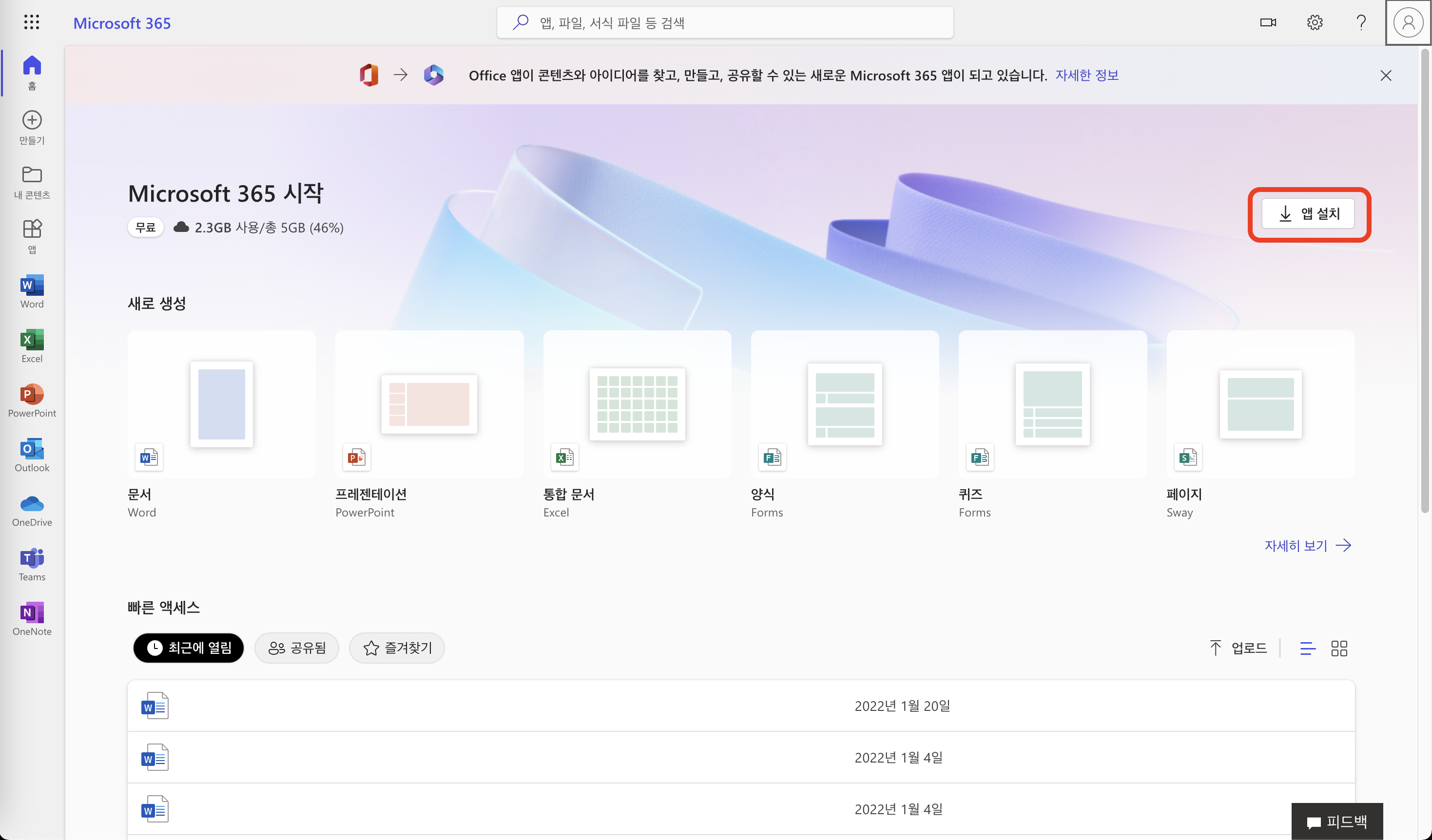 ① portal.office에 로그인 한 후 메인페이지에 있는 [앱설치]를 클릭한다.