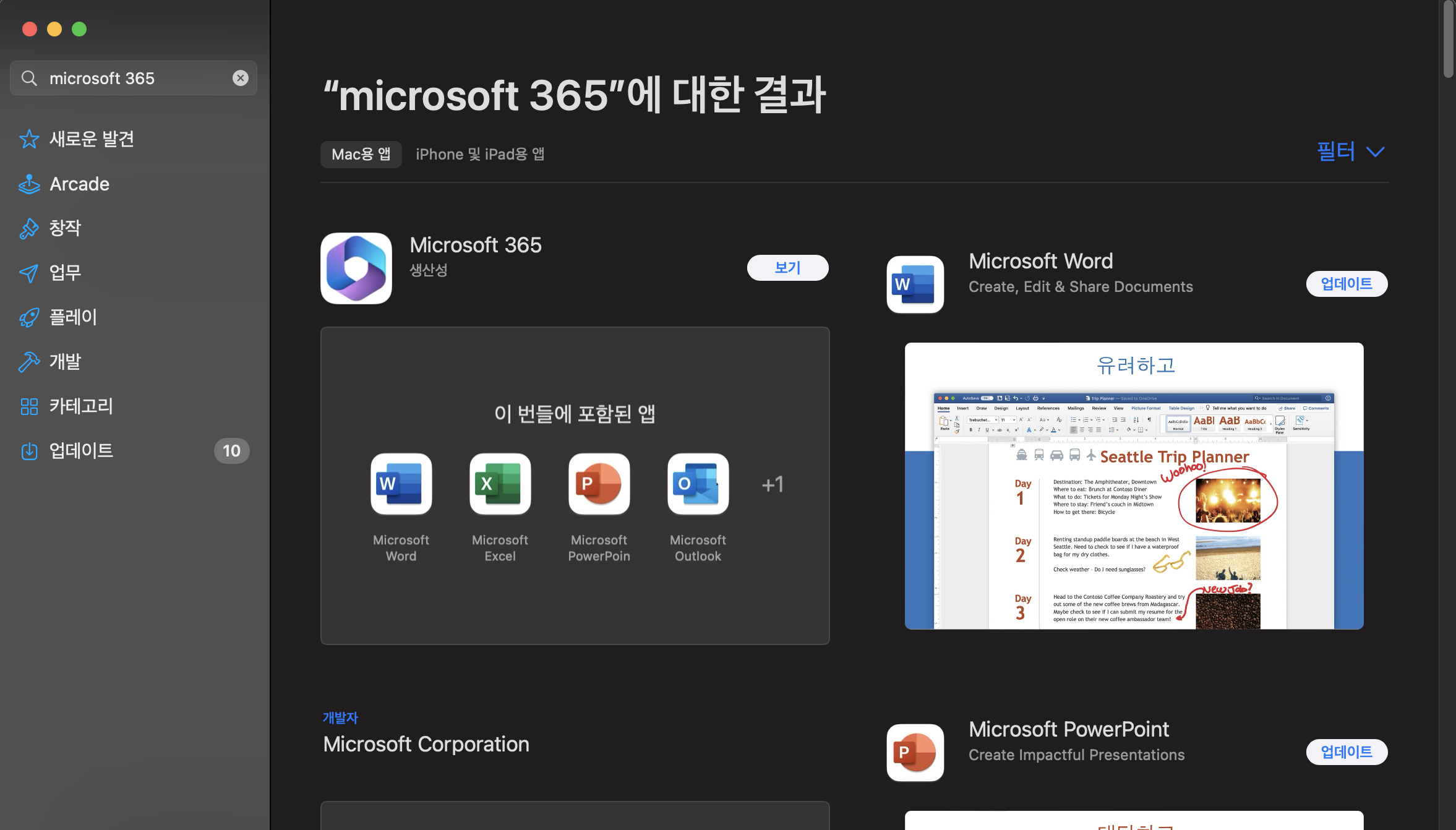 [app Store] 에서 microsoft 365를 검색한 후에 해당 앱을 다운받으면